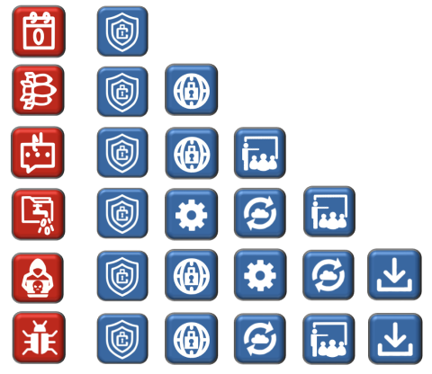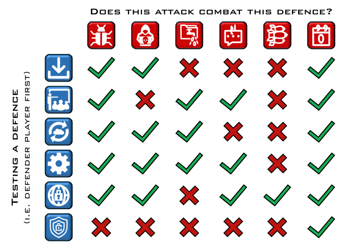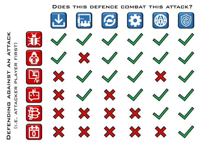 To win a round players need to throw more defence dice than the corresponding attack (or vice versa) – e.g. if 2 Malware dice are thrown then defenders need 3+ of other relevant dice to defend (e.g. 3 Backup, 3 Configuration or 3 Internet Security).